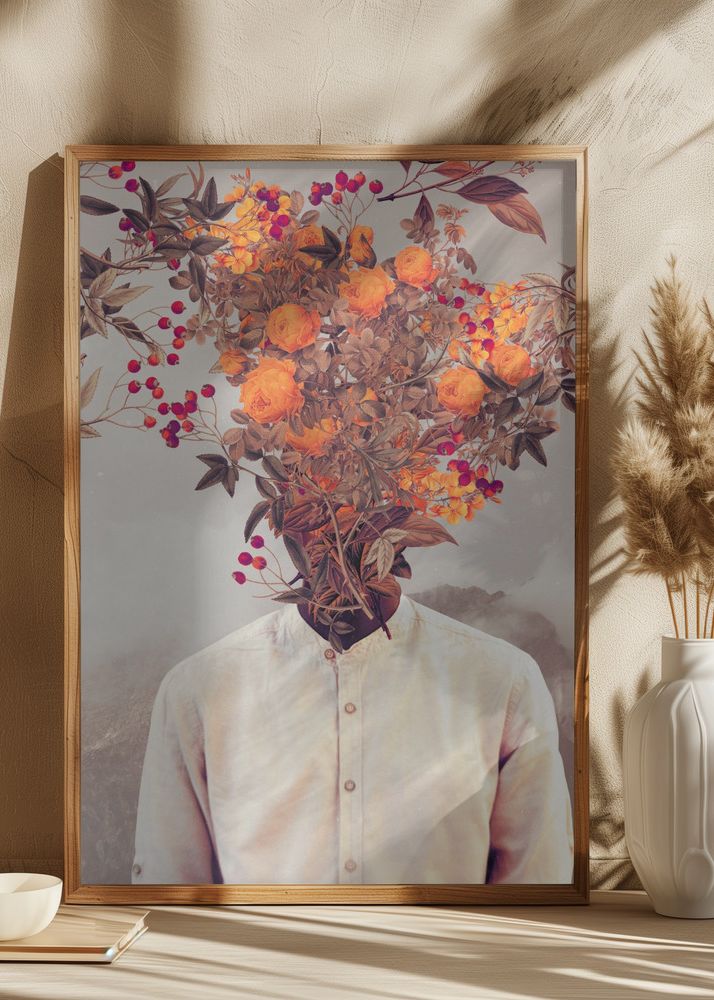 Denna unika poster föreställer en fascinerande blandning av naturens skönhet och kreativ konst. Med ett motiv som visar en person vars huvud är förvandlat till en explosion av blommor och lövverk, ger denna print ett drömskt och surrealistiskt intryck. Den mjuka övergången från verklighet till konstfantasi fångar betraktarens öga och väcker nyfikenhet.