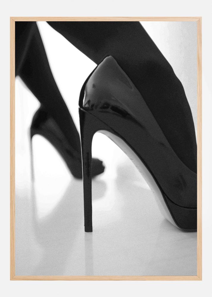 Denna eleganta poster fångar ett stilrent motiv av svarta högklackade skor i fokus. Det är en perfekt print för att skapa en modern och sofistikerad känsla i ditt hem eller kontor. De blanka skorna och det minimalistiska upplägget gör att affischen lätt kan passa in i både enskilda rum och som en del av en större tavelvägg.