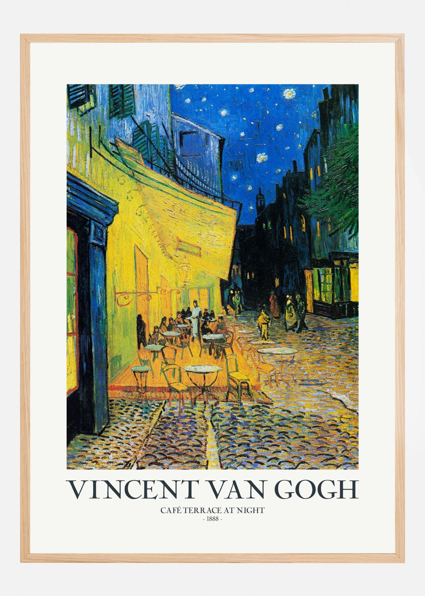 Denna poster presenterar Vincent van Goghs ikoniska verk "Café Terrace at Night." Tavlan skildrar en livlig kaféscen under en stjärnklar natt. Med levande färgkontraster har van Gogh fångat en atmosfär där det gula ljuset från kaféets lyktor står i skarp kontrast mot den djupt blå natthimlen. Denna print är perfekt för dem som vill addera en klassisk touch till sina väggar och för dem som älskar impressionism.