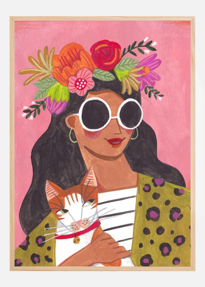 Denna färgsprakande poster fångar en känsla av livfullhet och stil med sin unika illustration. Motivet visar en kvinna strålande av självförtroende iklädd stora solglasögon och en blommig huvudprydnad som utgör en färgexplosion av röda, orange och rosa toner. Vid hennes sida finns en charmig katt, vars närvaro adderar en lekfull och varm känsla till printen. Den rosa bakgrunden förstärker de starka färgerna och ger affischen dess moderna och trendiga utseende.