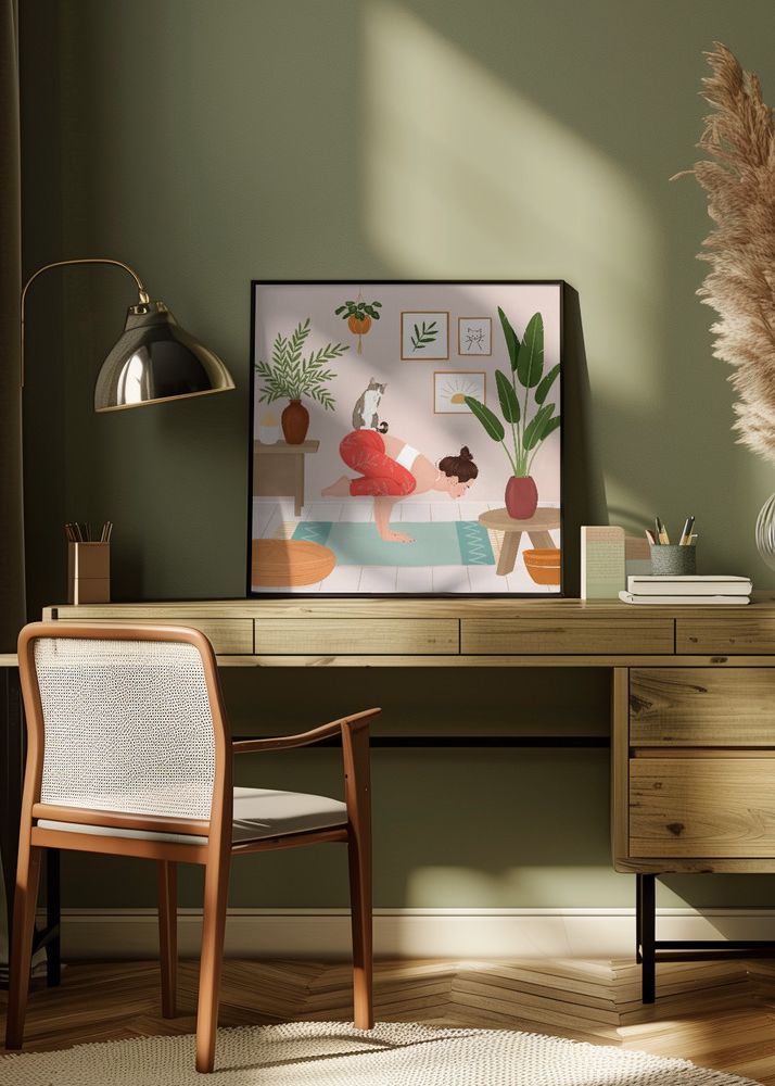 Denna stilfulla poster fångar en fridfull yogascen där en kvinna utför en balansövning i ett vackert inrett rum. En katt sitter harmoniskt på hennes rygg, vilket ger motivet en lekfull och hemtrevlig känsla. Postern är perfekt för dig som vill skapa en lugn och inspirerande atmosfär i ditt hem eller arbetsutrymme.