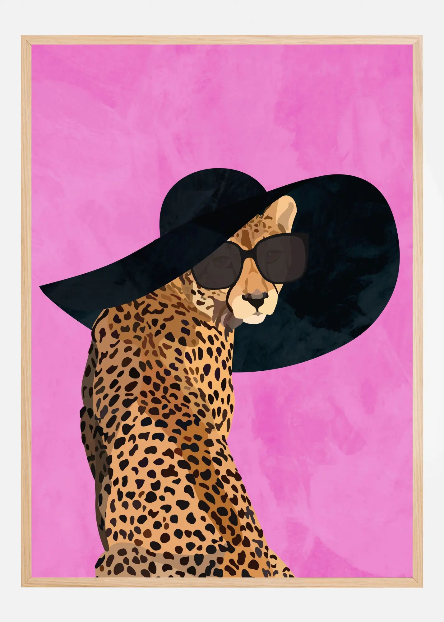 Bakgrunden på postern har en livfull rosa nyans som kontrasterar vackert mot gepardens guldbruna päls och den svarta hatten. Denna print fångar både elegans och lekfullhet i en harmonisk kombination av färger, vilket gör den till en utmärkt tillskott för dem som vill ge sitt utrymme en personlig touch.