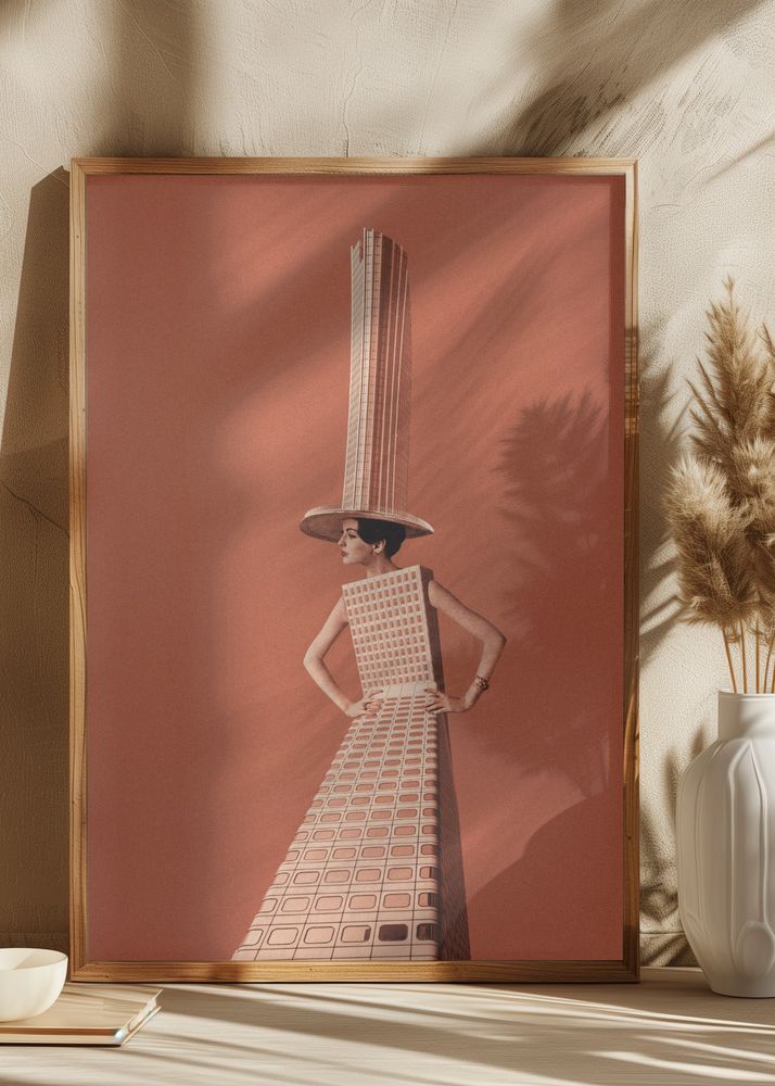 Motivet domineras av en varm, jordnära färgpalett, där en dämpad terrakottabrun ton utgör bakgrunden och kläderna. Denna välbalanserade färgkombination ger en harmonisk känsla samtidigt som den framhäver den unika designen. Denna affisch är idealisk för att ge en distinkt, konstnärlig touch till ditt rum.