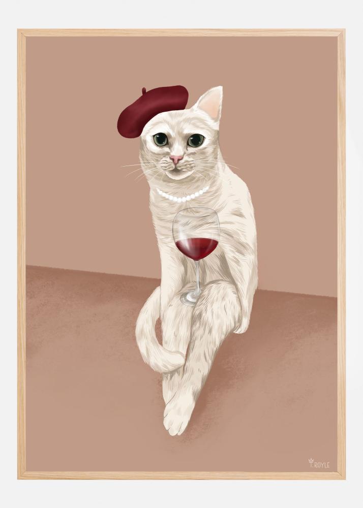 Motivet har en palett av jordnära toner med mjuka nyanser av beige och brunt som bakgrund, vilket kompletteras av den röda baskern och det rödaktiga vinet i kattens glas. Den harmoniska färgkombinationen gör att postern enkelt passar in i olika inredningsstilar. Ge din väggkonst en uppdatering med denna charmiga affisch som garanterat tillför både värme och personlighet.