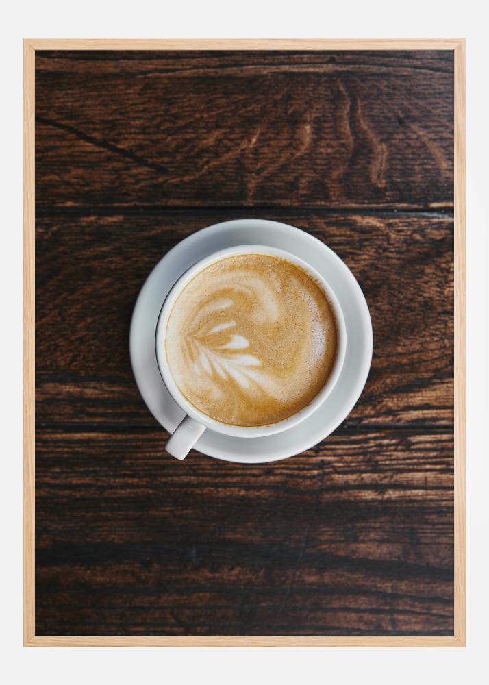 Denna välkomnande och värmande poster är en hyllning till kaffekulturen och perfekt för varje kaffeälskare. En toppvy av en klassisk vit kaffekopp på en mörkbrun träyta förmedlar en omedelbar känsla av komfort och en paus i vardagen. Skummet på kaffet har ett fint konstmönster, vilket bjuder in till en stund av avkoppling och njutning.