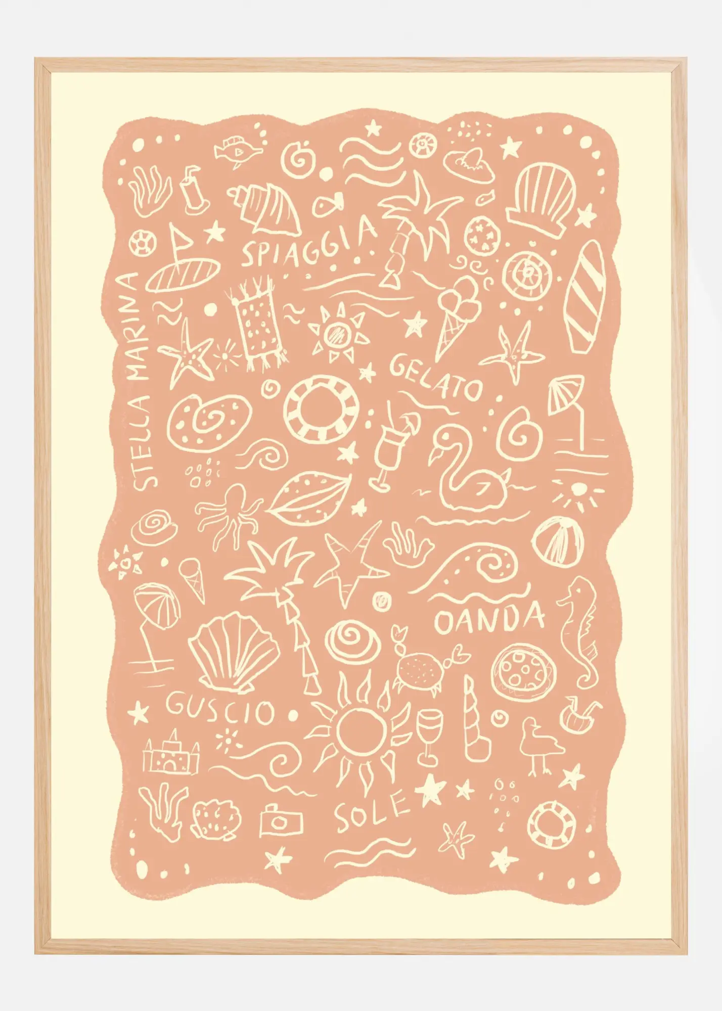Denna poster är en lekfull hyllning till sommarens glädje och strandens magi. Med en bakgrund i mjuk terrakottanyans framhävs olika charmiga handritade ikoner, inklusive palmer, sjöstjärnor, snäckor och symboler för sol och bad. Varje element bidrar till en livlig och avslappnad atmosfär, perfekt för att skapa sommarkänslor året runt. Texten "stella marina", "spiaggia", "gelato" och andra sommarrelaterade ord förstärker affischens känsla av semester och avslappning.