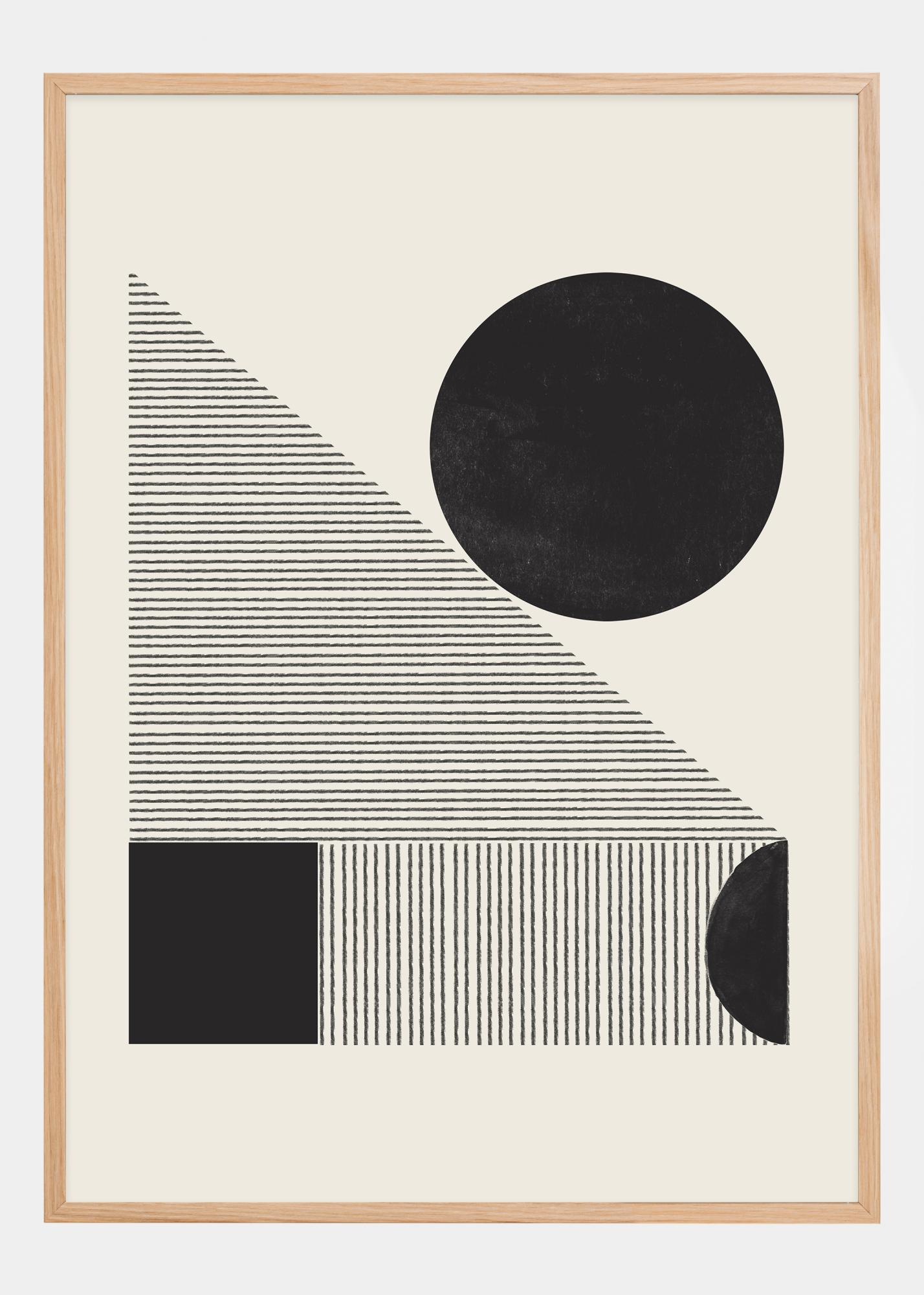 Denna poster är en lekfull och sofistikerad tolkning av geometrisk abstraktion. Svarta och vita linjer samspelar i ett noggrant balanserat mönster av former, medan den stora svarta cirkeln dominerar övre delen av kompositionen och skapar en stark visuell ankarplats. Det kontrasterande spelet mellan de fylliga svarta områdena och de vita linjerna inbjuder betraktaren att utforska de olika texturerna och djupen i bilden.