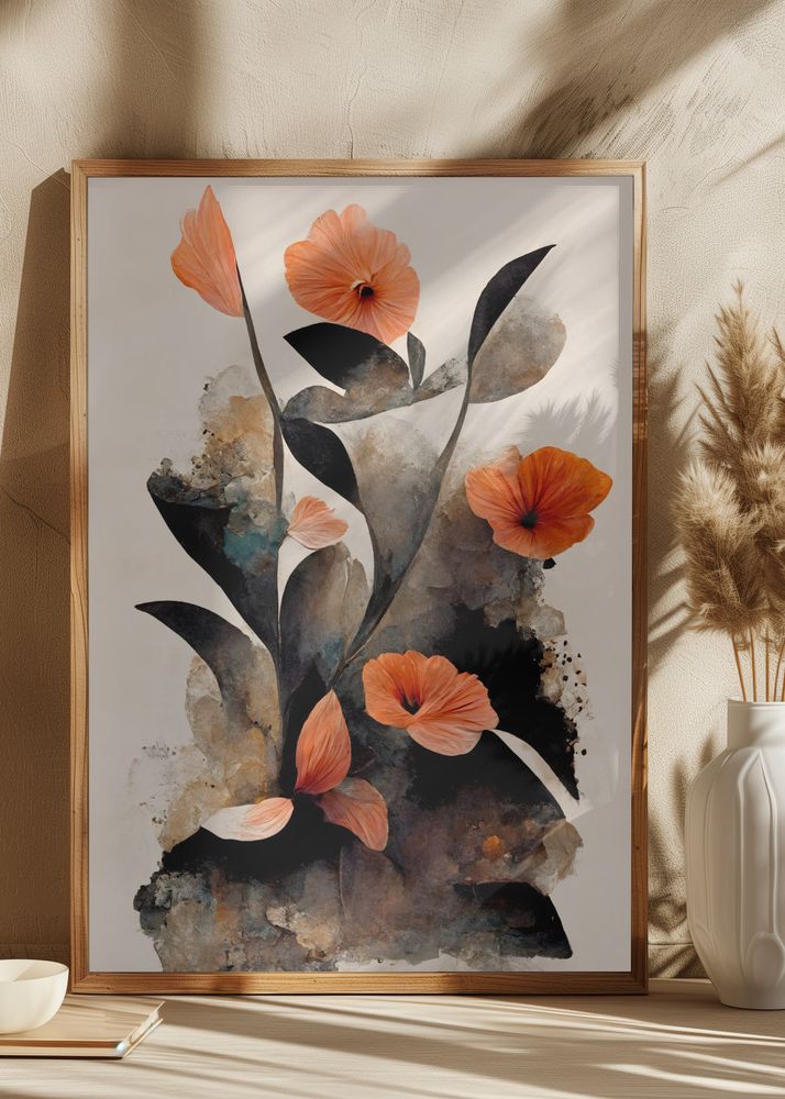 Denna poster fångar ögat med sina livfulla orangea blommor som elegant sträcker sig uppåt mot en neutral bakgrund. De svarta bladen skapar en stark kontrast och ger motivet en modern och dramatisk känsla. Perfekt som print för att ge ditt utrymme en färgstark och sofistikerad touch.