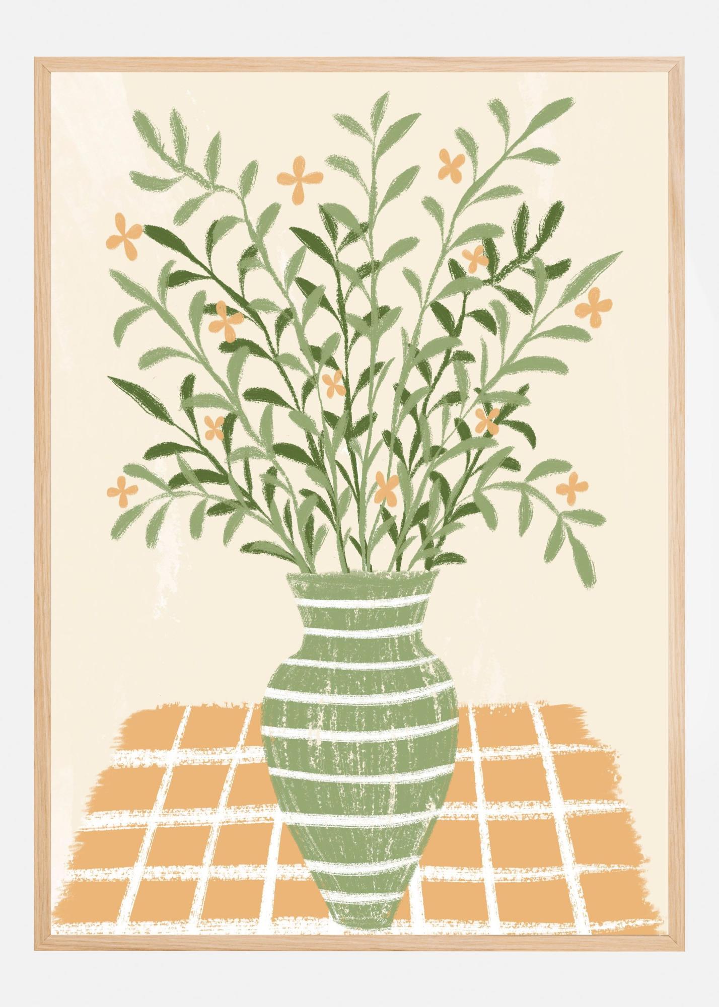 Denna vackra poster visar en stiliserad illustration av en grön vas med delikata blommande grenar. De gröna nyanserna i vasen och bladen skapar en harmonisk och lugnande känsla, perfekt för alla rum i ditt hem. De små, mjukt orangea blommorna på grenarna ger en fin kontrast och livfullhet till motivet.
