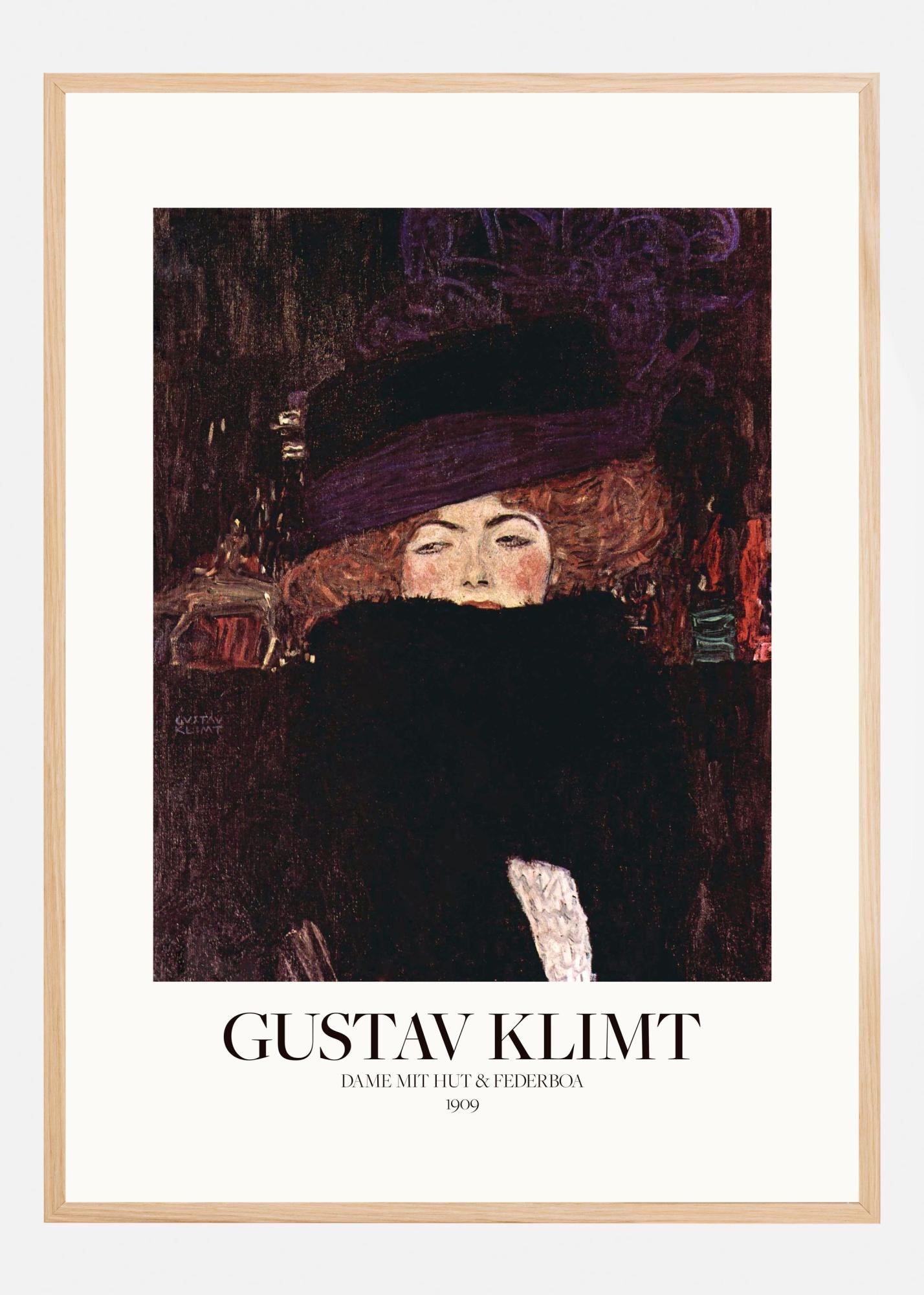 Upptäck den fängslande skönheten i denna poster föreställande Gustav Klimts verk "Dame mit Hut & Federboa". Bilden fångar en elegant dam klädd i en djup lila hatt och en svart boa, vilket markerar hennes sofistikerade stil. Verket är ett utmärkt exempel på Klimts känsla för detaljer och färgval, och det erbjuder en fascinerande inblick i tidens mode och estetik.