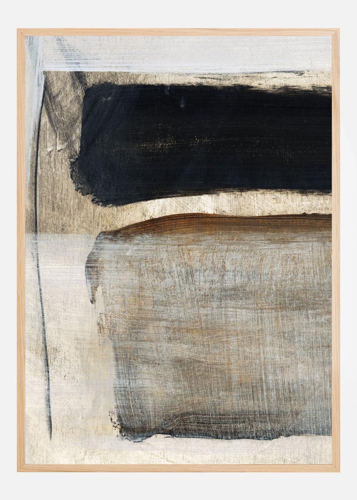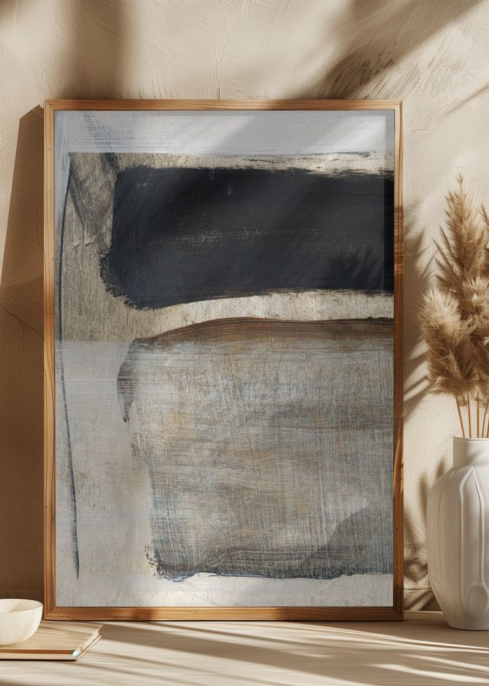 Denna poster visar upp ett elegant och abstrakt motiv som genast drar blickarna till sig. Med breda penseldrag i en mörkblå nyans överst och en jordnära, brunaktig ton nedtill, skapar den en balanserad men kraftfull visuell upplevelse. Den minimalistiska designen gör denna affisch till ett perfekt tillskott i både moderna och klassiska interiörer.