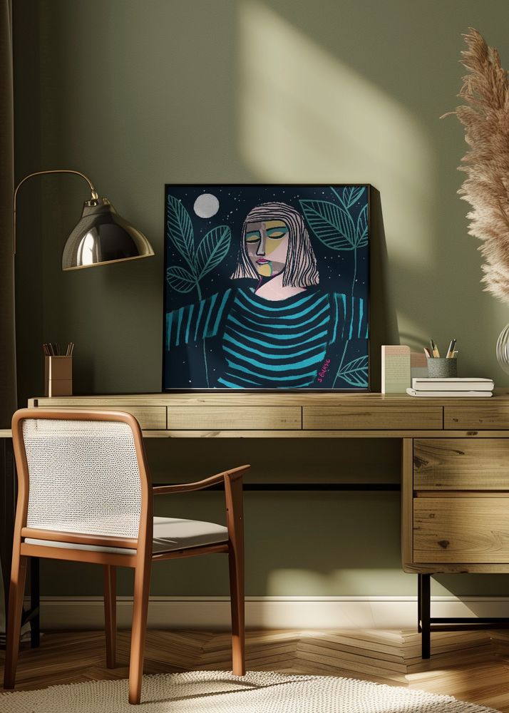 Motivet innehåller en rik färgpalett med inslag av mörkblått, vitt, grönt och rosa, vilket gör denna affisch till ett blickfång i vilket rum den än placeras. Det unika illustrativa greppet gör att bilden verkligen sticker ut och passar både i vardagsrum som i kreativa utrymmen. Oavsett om du letar efter något stilrent eller vill ha en färgklick, kommer denna print att förvandla och lysa upp ditt utrymme.