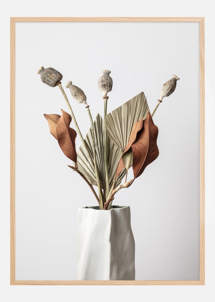Denna sofistikerade poster visar en elegant komposition av torkade växter och frökapslar som stiger ur en stilren vit vas. Arrangemanget är en hyllning till den stillestående skönheten i växternas värld, med varierande nyanser från grått och brunt till djupa roströda och grönaktiga toner. Denna print fångar ögonblicket av stillhet, där varje växts unika form och textur blir evigt bevarad i konstens form.