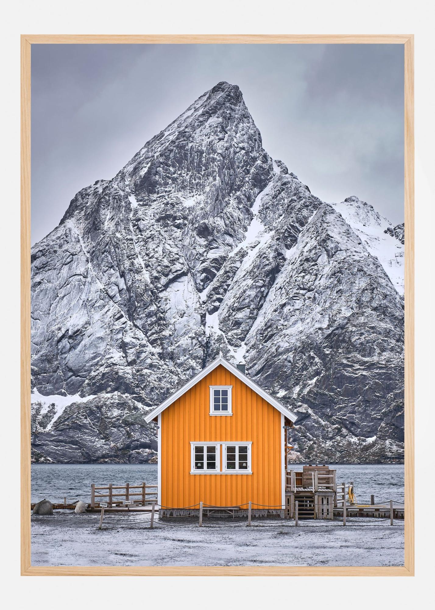 Färgerna i affischen inkluderar nyanser av grått och vitt i bergen och himlen, medan den vibrerande orangea stugan ger en livfull kontrast mot det kyliga landskapet. Denna print är idealisk för att tillföra en unik och harmonisk atmosfär till ditt utrymme. Utforska fler prints i vår kollektion för att hitta den perfekta kombinationen för din personliga stil.