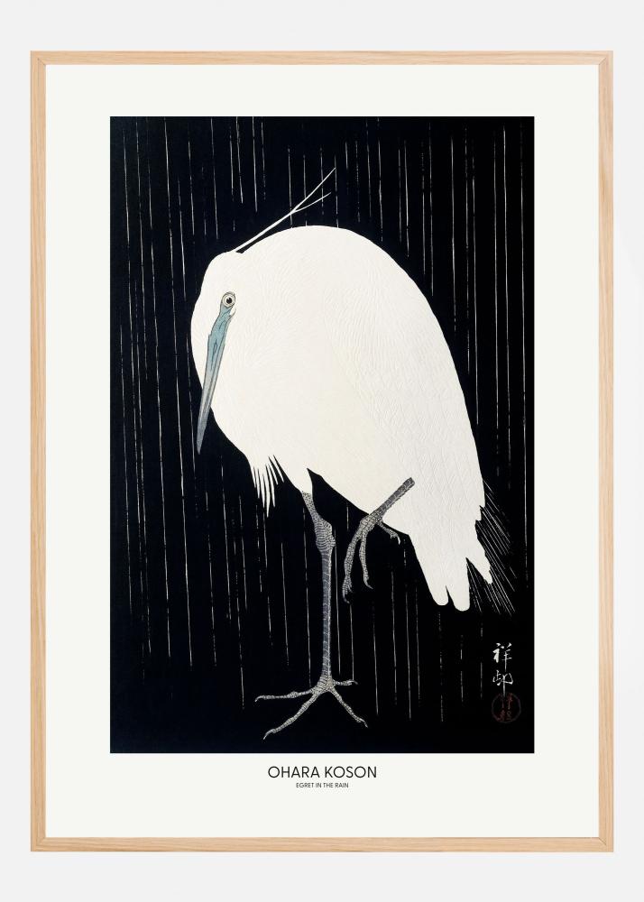 Denna eleganta poster föreställer en vit häger, stående i en stiliserad regnvägg, fångad i ett ögonblick av stillhet och skönhet. Bildens minimalistiska design framhäver fågelns gracila form och de fina detaljerna i dess fjäderdräkt. Denna typ av print är perfekt för att ge din inredning en touch av naturlig elegans och lugn, samtidigt som den väcker intresse och samtal kring dess konstnärliga uttryck.
