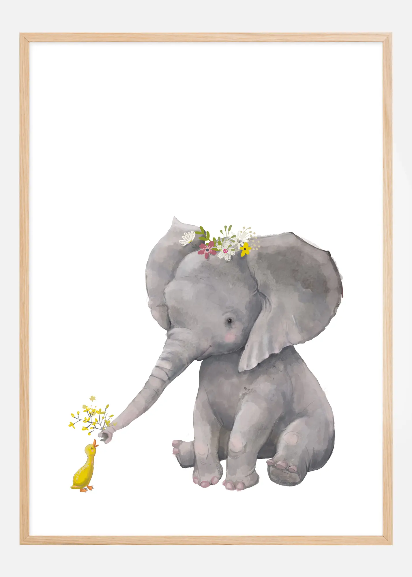 Med sin bedårande framtoning och vänliga interaktion mellan arterna, fångar denna affisch essensen av vänskap och oskyld. Illustrationen framställer en ung elefant, vars huvud pryds av en krans av färska blommor, medan den försiktigt håller en liten bukett mot en förväntansfull andunge. Denna bild av ömsesidig nyfikenhet och lekfullhet gör konstverket till en hjärtevärmande tillägg i varje barns lekrum eller sovrum.