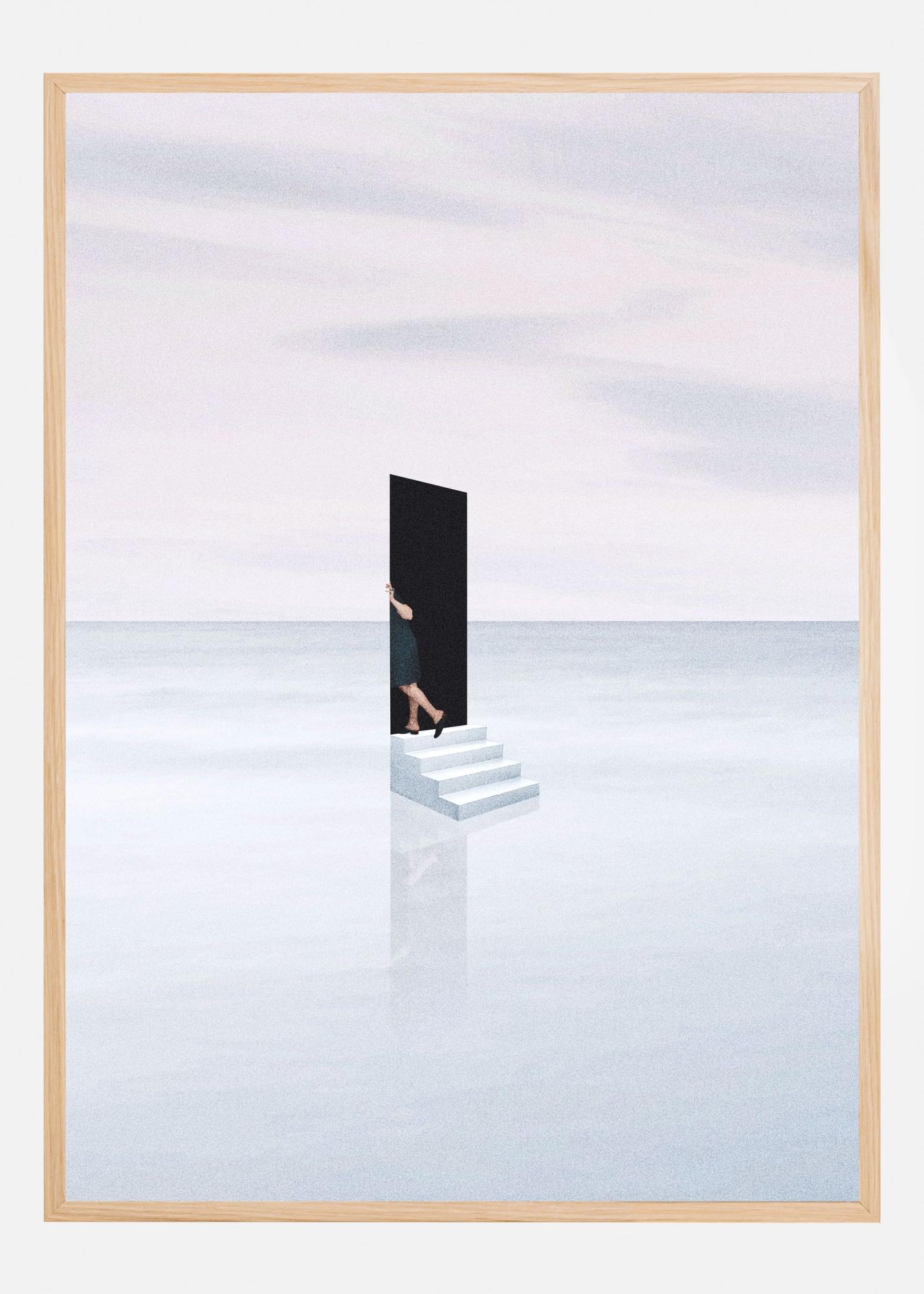 Denna poster föreställer en mystisk och drömlik scen där en person står vid en svart dörr som leder ut till ett oändligt hav. Bildens lugnande toner ger en känsla av lugn och eftertänksamhet, perfekt för att skapa ett meditativt inslag i ditt hem eller kontor. Affischen kan enkelt bli en konversationsstartare, med sina subtila detaljer och surrealistiska stil.