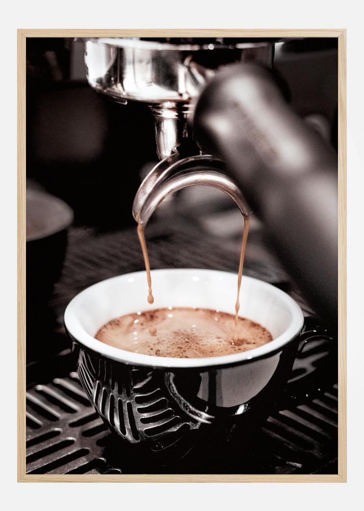 Denna affisch fångar en nästan sensuell stund av en espresso som bryggs till perfektion, där de gyllenbruna dropparna av kaffe möter den porslinsvita koppen i en intim dans. Det är en ode till kaffeälskare och konnässörer, en bild som förmedlar både den rika aromen och den starka smaken som espresso erbjuder. Den selektiva fokusen på kaffets ström och koppen nedanför, mot den suddiga bakgrunden av espressomaskinen, skapar en effekt som gör att betraktaren kan nästan känna värmen och höra suddet av ångan.