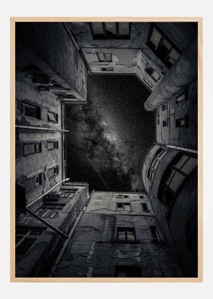 Affischen kombinerar stadens arkitektoniska skönhet med den naturliga skönheten hos det kosmiska, vilket skapar en suggestiv kontrast mellan det urbana och det universella. Det monokroma färgschemat med sina nyanser av svart, vitt och grått gör bilden lätt att integrera i olika inredningsstilar och den skulle vara en intressant samtalsöppnare i vilket rum som helst.