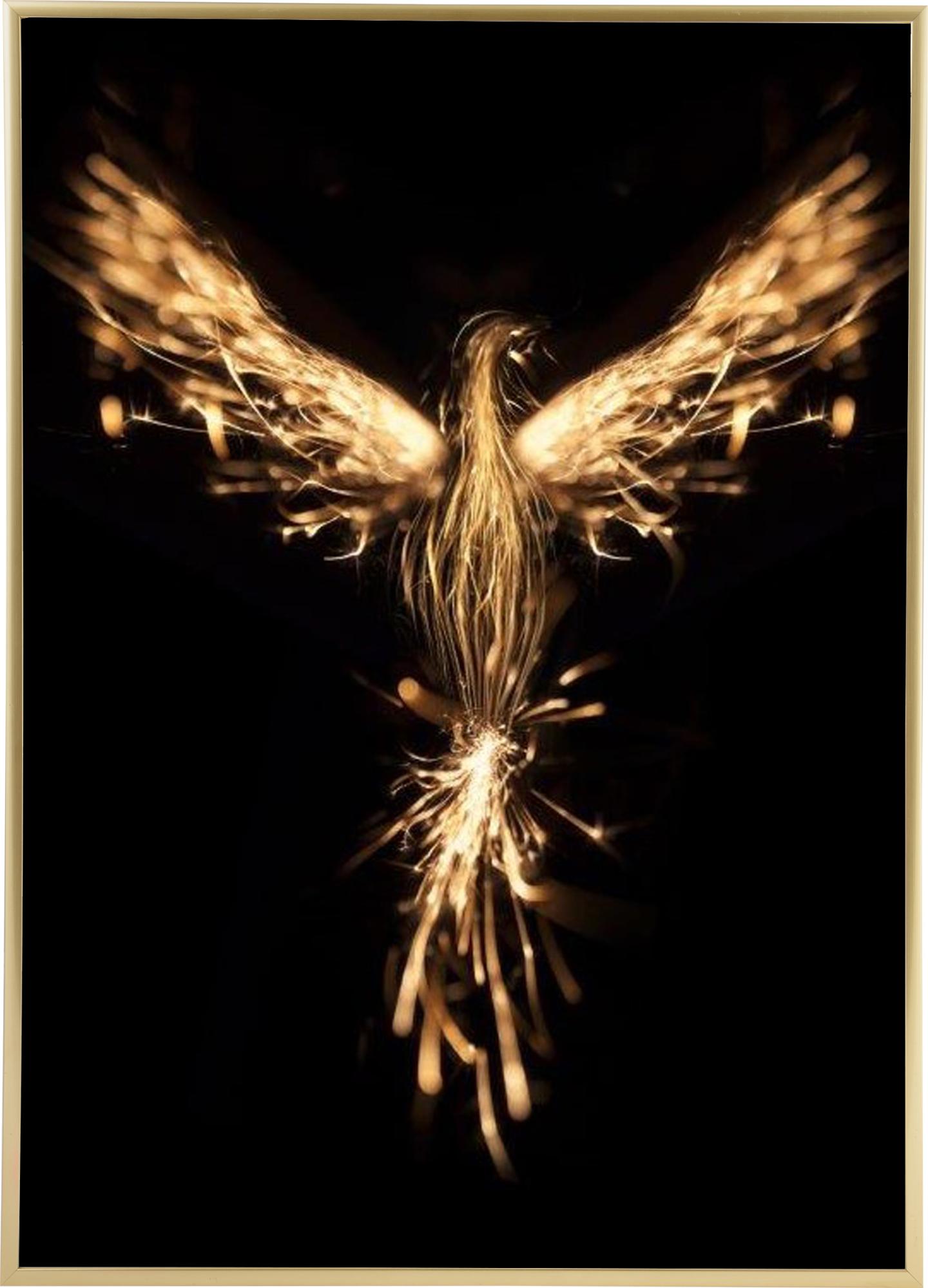 Genom grafisk konst tar fågeln Fenix form i ett fyrverkeri av guldfärgade toner mot en svart bakgrund. En varm och behaglig poster i ett minimalistiskt format, perfekt att matcha med andra favoriter i ett större collage.