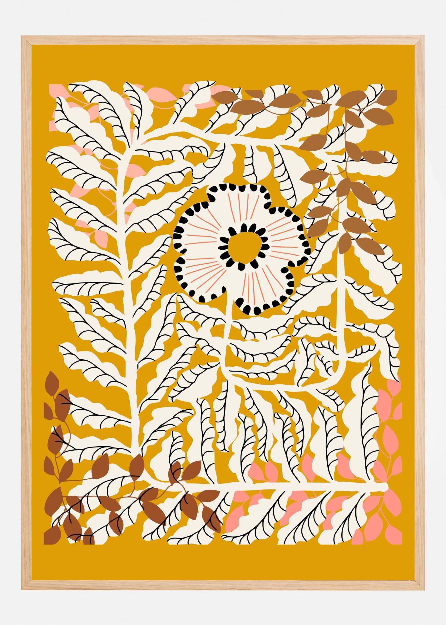 Denna poster erbjuder en fascinerande symmetri av lövverk där varje detalj fångar ögat. Med en färgpalett bestående av gyllene gul, vit, brun och en stänk av rosa skapar detta motiv en känsla av värme och kreativitet. Designen är perfekt för att förnya vilket rum som helst, och passar utmärkt för dig som älskar att inreda med konstfulla och trendiga prints.