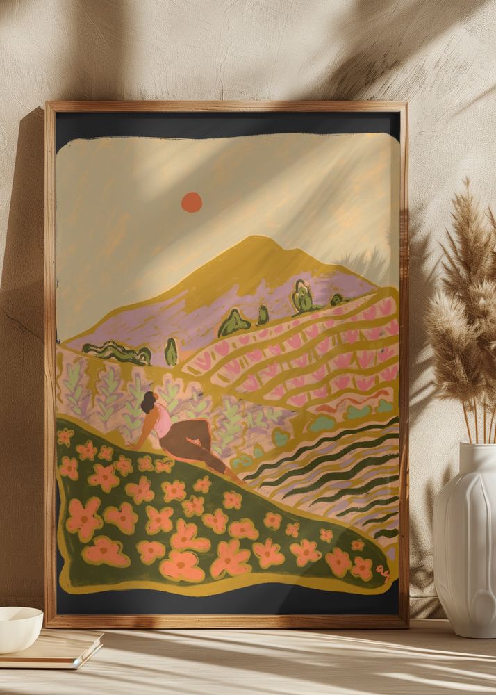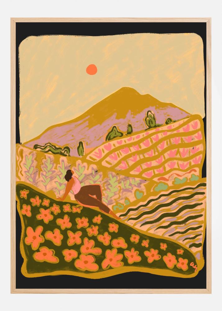 Upptäck en levande och uttrycksfull poster som fångar naturens skönhet med ett modernt konstnärligt uttryck. Det här motivet visar en kvinna vilandes i en vackert kuperad landsbygd, omgiven av blommor och åkrar. Denna print är perfekt för att ge ditt hem en färgklick och en känsla av rofylldhet.