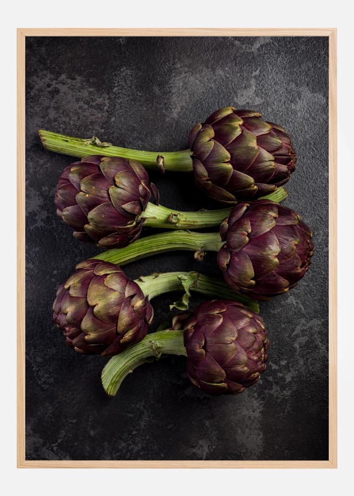 Denna rustika och naturinspirerade poster skildrar fem nyansrika kronärtskockor mot en mörk, texturerad bakgrund. Det närgångna fotot lyfter fram de djupgröna och purpurröda nyanserna i kronärtskockornas blad, och det jordnära motivet skulle passa väl i ett kök eller matsal där det kan inspirera till kulinariska äventyr. Denna print är inte bara en hyllning till naturens skönhet utan också en påminnelse om den färska matens förmåga att föra samman människor.