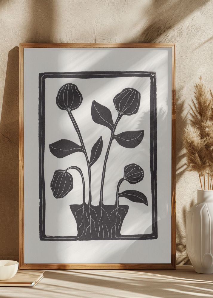 Denna stilrena affisch förmedlar en känsla av balans och enkelhet med sitt minimalistiska motiv av växter. Det svartvita printet ger en tidlös elegans som passar perfekt i både moderna och klassiska inredningar. Motivet inomhus ramen fångar skönheten i form och struktur, vilket gör det till ett uttrycksfullt konstverk i ditt hem.