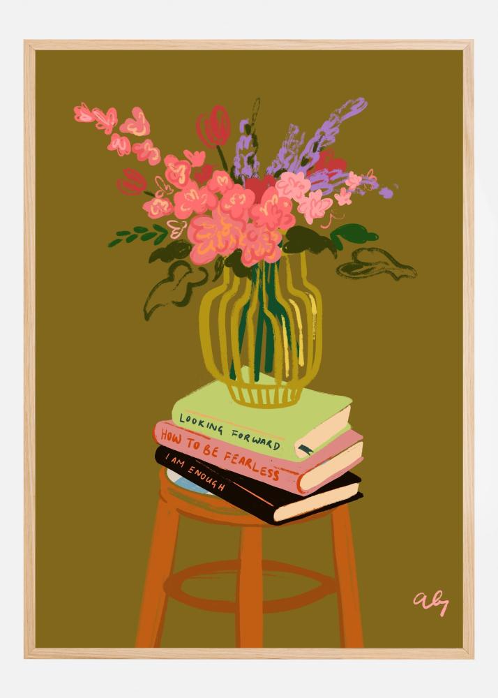 I motivet ingår även en samling av böcker med titlarna "Looking Forward", "How to Be Fearless" och "I Am Enough". Dessa inslag i affischen ger både en retro och intellektuell känsla, vilket skapar en inspirerande atmosfär. Den varma bruna bakgrunden framhäver färgerna på blommorna och böckerna, vilket gör denna poster till ett utmärkt val för dem som söker en unik och livfull väggdekoration.