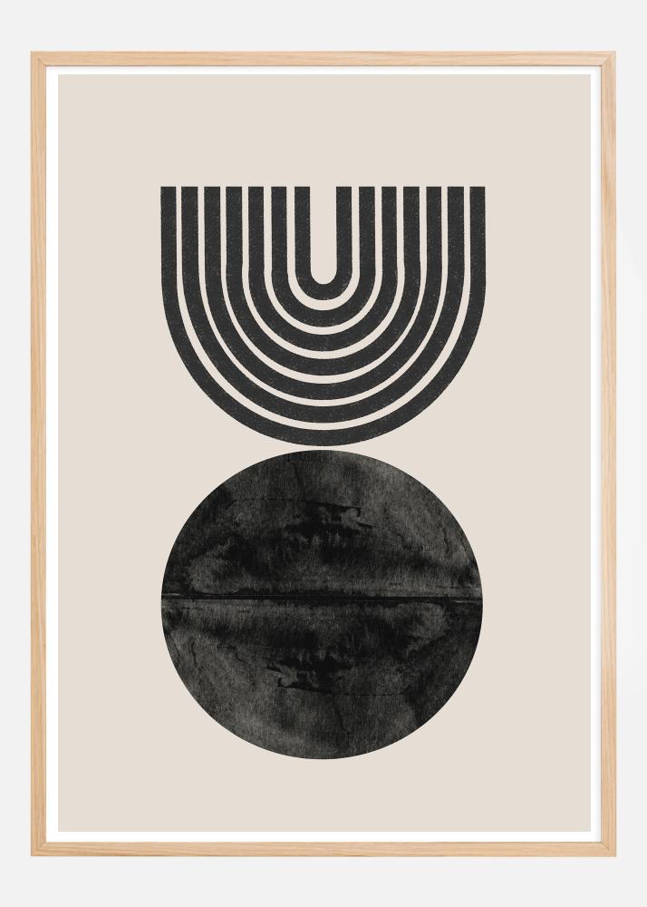 Denna konstfulla affisch fångar ögat med sin djärva kontrast och fascinerande komposition av geometriska och organiska former. Överst framträder en serie svarta linjer som skapar en halvcirkelform, vilket ger en stark visuell struktur mot den lugna, neutrala bakgrunden. Nedanför ser vi en texturerad svart cirkel som påminner om reflektioner i vatten, vilket tillför en djup och mystisk kvalitet till designen. De utvalda färgerna i svart och off-white skapar en tidlös palett som tilltalar en mängd olika smaker och inredningsstilar.