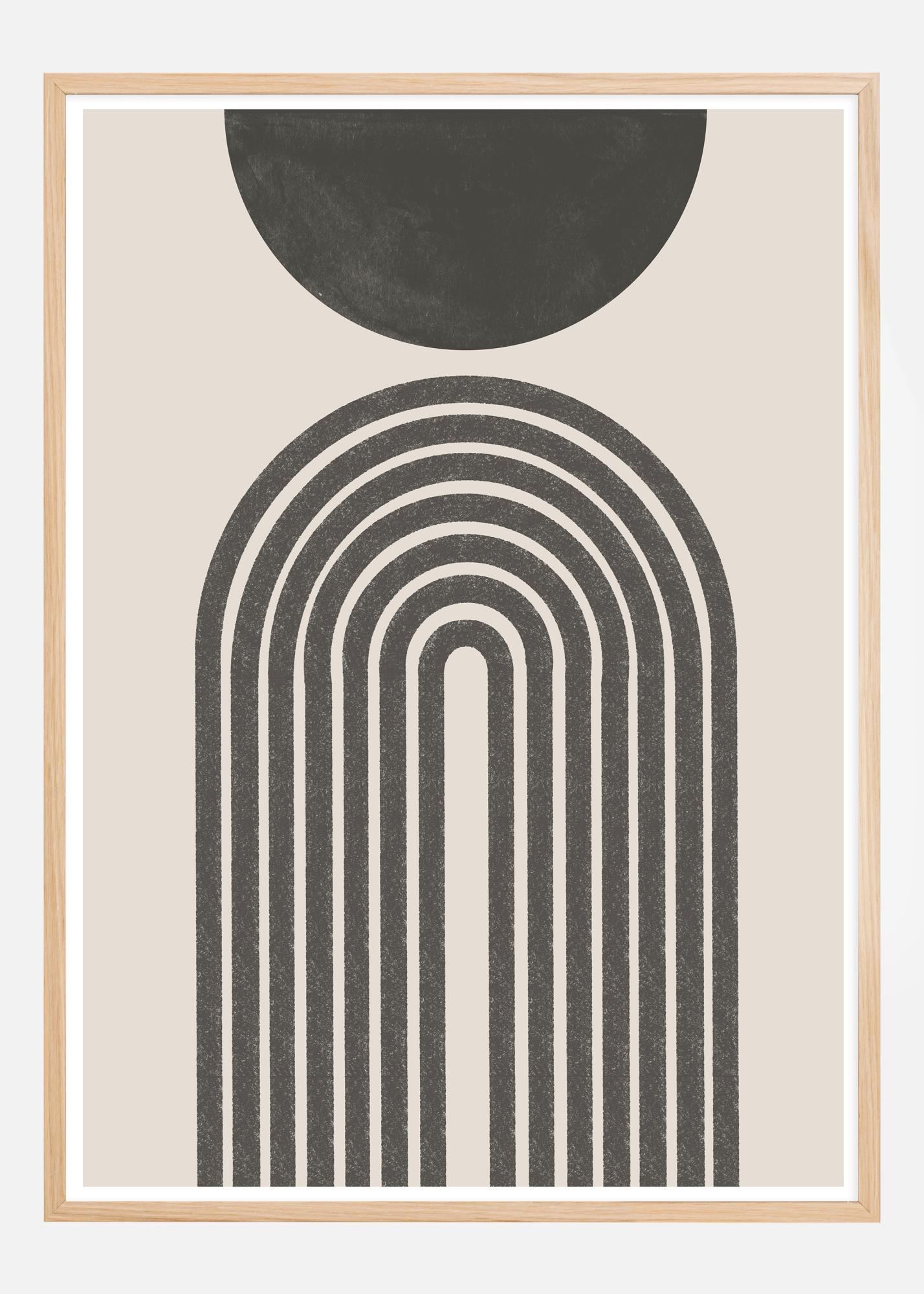 Denna konstnärliga poster visar en sammansmältning av geometrisk precision och organisk mjukhet. Den övre delen av designen utgörs av en svart halvcirkel som strålar ut en lugnande närvaro mot den varma, neutrala bakgrunden. Under detta, reser sig en serie svarta bågar som harmoniskt bildar en portalliknande form, vilket skapar en kontrast mellan den strikta geometrin och den svarta cirkelns abstrakta kurvor. Den enkla färgsättningen med svart mot en off-white bakgrund ger ett modernt och elegant intryck, perfekt för det samtida hemmet eller kontoret.
