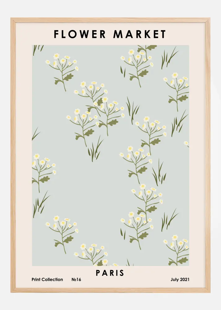 Denna charmiga och stilfulla affisch tar dig direkt till hjärtat av Paris med sin bild av en blomstermarknad. Den presenterar ett mönster av delikata vita blommor mot en lugnande gråblå bakgrund, vilket ger en känsla av fräschör och enkel elegans. Överst står texten "FLOWER MARKET" i en klassisk typografi, medan botten innehåller texten "Print Collection ?16 PARIS July 2021", vilket tillför en känsla av autenticitet och kulturell kontext.