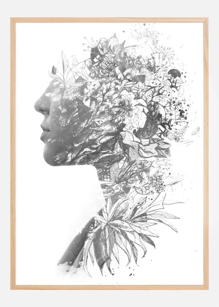 Denna konstnärliga poster kombinerar en kvinnas profil med en detaljerad och intrikat illustration av blommor och växter, vilket skapar en fascinerande fusion av mänsklig gestalt och naturens finstämda detaljer. Den svartvita färgschemat ger en tidlös känsla och framhäver den subtila textur och komplexitet i både den mänskliga figuren och de blommiga motiven.