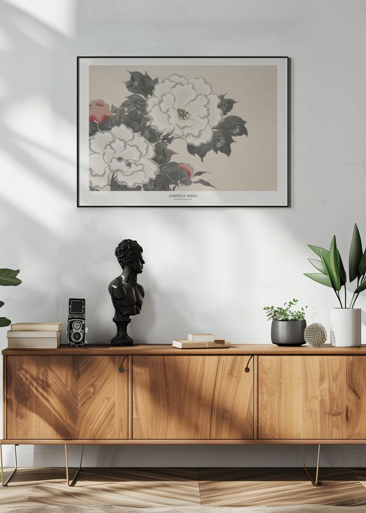 Den här eleganta postern visar ett motiv av vackra, stiliserade blommor i traditionell japansk stil. De stora vita blommorna står i kontrast mot sina mörkgröna blad, och en subtil röd accent breder ut sig över några av blomknopparna. Detta print är ett perfekt tillskott för att ge ditt hem en känsla av klassisk skönhet.