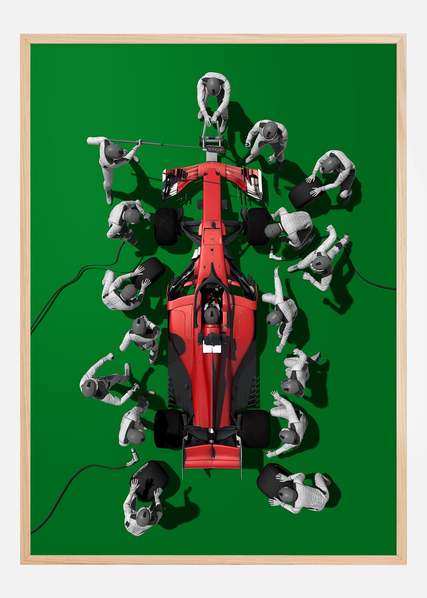 Med en explosion av färg och handling ger denna fängslande poster en glimt av den adrenalinfyllda världen av Formel 1. Mot en djärvt grön bakgrund framställs den ikoniska scenen av ett pitstop, där ett team av mekaniker i silver och vit arbetar i perfekt synkronisering runt en skarpt röd racerbil. Denna kontrastrika komposition är en hyllning till snabbhetens konst och motorsportens precision.
