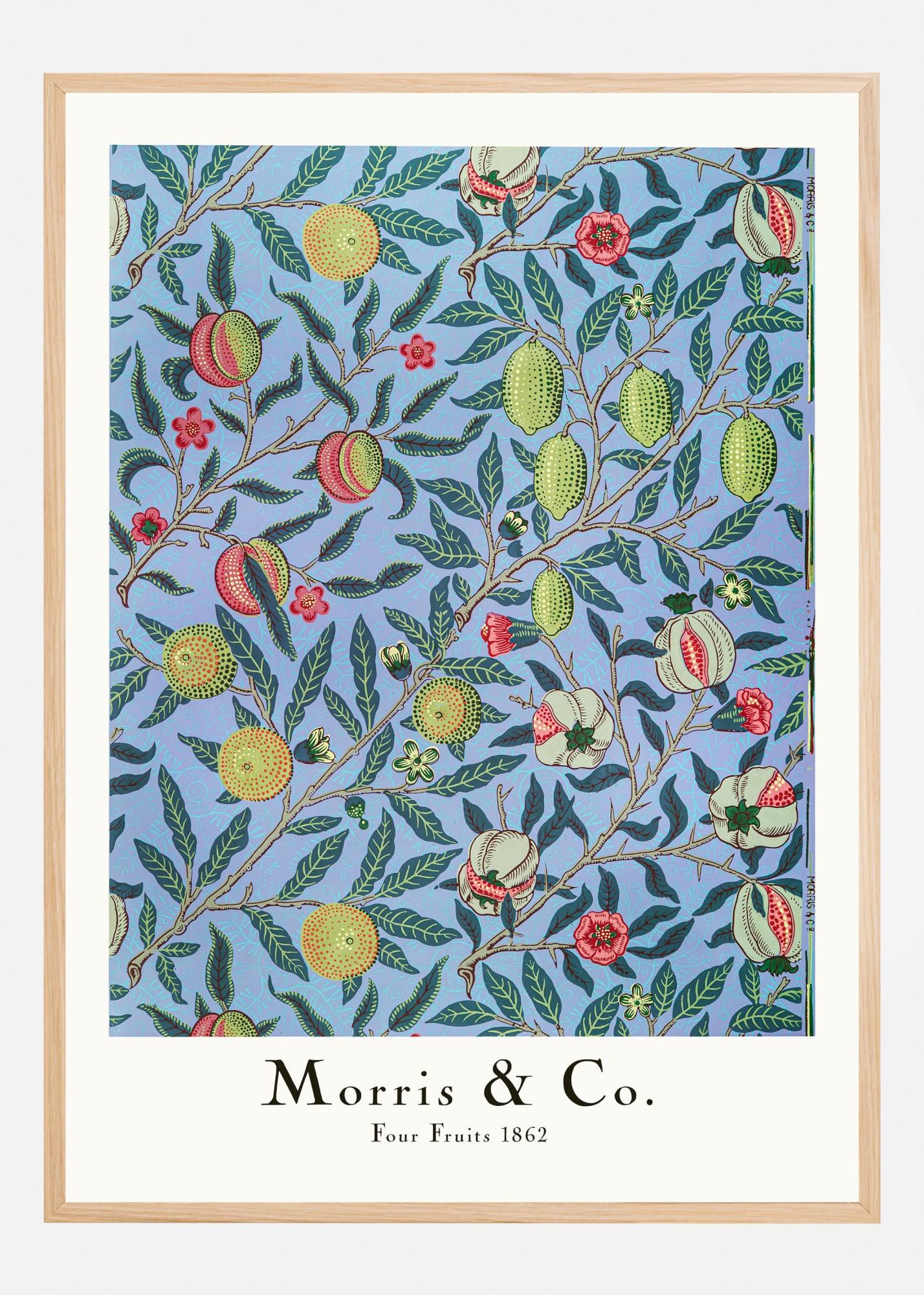 Den här vackra postern från Morris & Co. med titeln "Four Fruits 1862" fångar essensen av naturens rikedom genom sitt detaljerade mönster av frukter och blad. Motivet visar olika sorters frukter i en konstnärlig komposition som både är tidlös och modern. Den blå bakgrunden skapar en harmonisk kontrast till de levande färgerna i designen, vilket gör denna affisch till en utmärkt dekoration för alla rum.