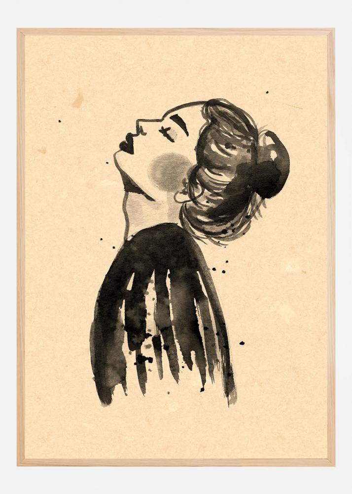 Denna eleganta poster fångar en stiliserad profil av en kvinna i en drömsk pose, med en känsla av tidlös skönhet och eftertänksamhet. Det svartvita trycket ger en klassisk och sofistikerad känsla som gör sig väl i både moderna och traditionella inredningar. Den konstnärliga stilen, med skarpa linjer och mjukt suddiga kanter, ger motivet ett unikt uttryck och lockar till återkommande betraktelser.