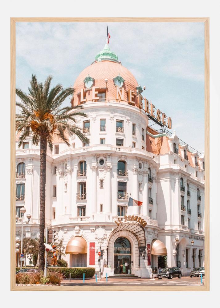 Denna eleganta poster fångar den imponerande arkitekturen av ett historiskt hotell i vackert solljus. Med den ikoniska kupolen i en mjuk kopparfärg och Kontrasterande med fasadens ljusa, krämvita färg, drar affischen in betraktaren till en plats full av sofistikation och charm. Den palmbeklådda boulevarden framför byggnaden ger en känsla av Medelhavets värme och stil.