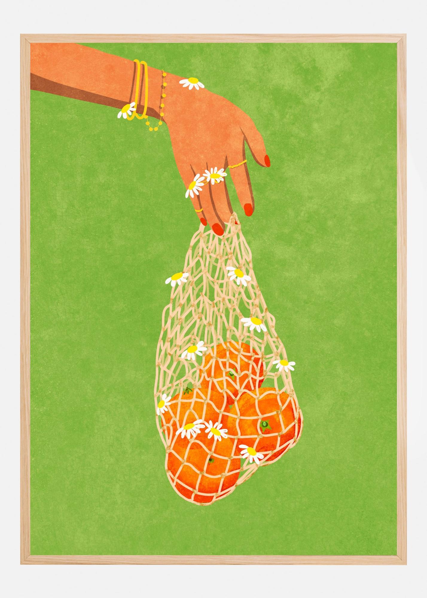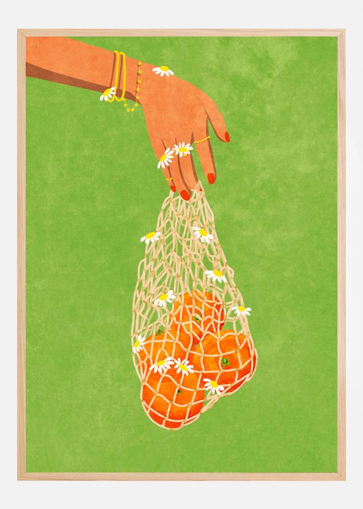 Denna färgstarka poster är en hyllning till det enkla och naturliga. Motivet visar en hand som varsamt håller i ett nät som är fyllt med saftiga apelsiner. Runt nätet slingrar sig små, vita blommor som lägger till en charmig detalj. Den gröna bakgrunden ger en fräsch och livfull känsla, vilket gör denna affisch perfekt för att sprida glädje och harmoni i vilket rum som helst.