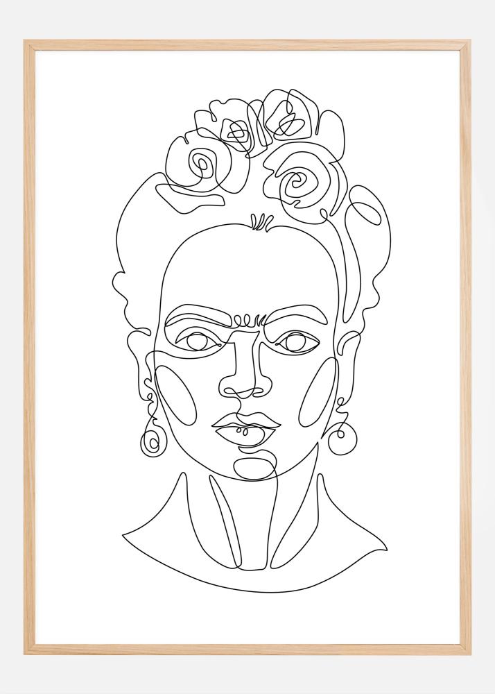 Denna minimalistiska poster framställer en stilren linjeteckning av en kvinnofigur med en elegant uppsyn, prydd med blommor i håret och klassiska örhängen. Konstverket är utformat i en enda kontinuerlig linje som ger en modern twist på det traditionella porträttet. Färgpaletten är ren och enkel, begränsad till svarta linjer på en vit bakgrund, vilket ger en avskalad känsla som passar väl in i ett modernt eller minimalistiskt hem.