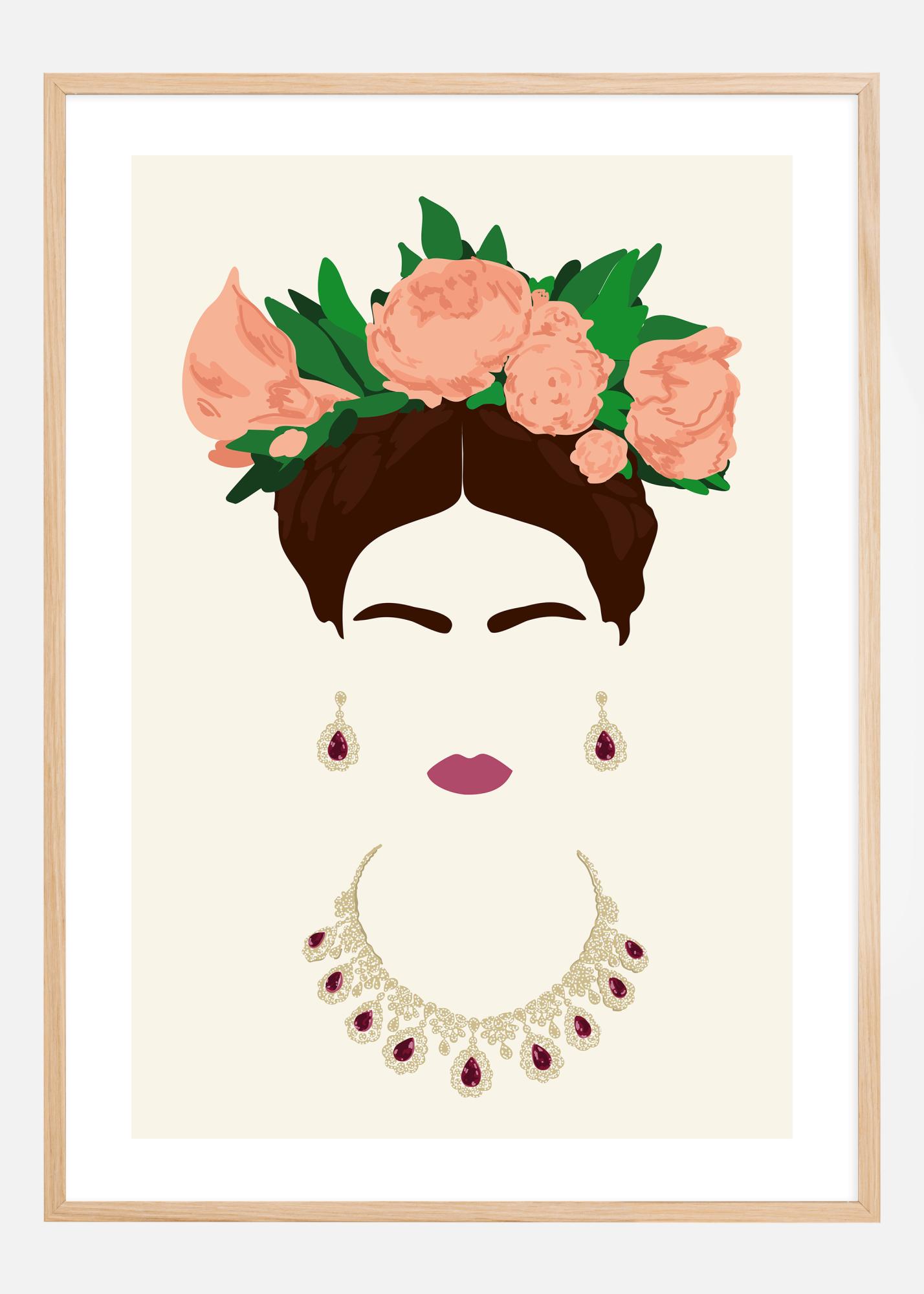Denna distinkta poster avbildar en stiliserad kvinnofigur prydd med en rik flora och eleganta smycken. Motivet framställer en harmonisk sammansättning av mörkbrunt hår, krämfärgad hud och en strålande krans av korallrosa blommor kompletterat med mörkgröna blad. Hennes ansiktsdrag är reducerade till minimalistiska former, vilket ger en modern känsla.