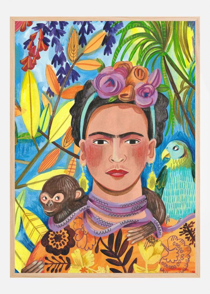 Den här färgstarka postern fångar ögat med sitt uttrycksfulla motiv av en kvinna omgiven av en tropisk flora och fauna. Detaljerna är livfulla och inkluderar både en apa och en papegoja som bidrar till en exotisk känsla. Mönstren och färgerna i kvinnans kläder ger en känsla av rikedom och kultur, vilket gör denna print till ett perfekt tillskott för den som vill ha något unikt och konstnärligt.