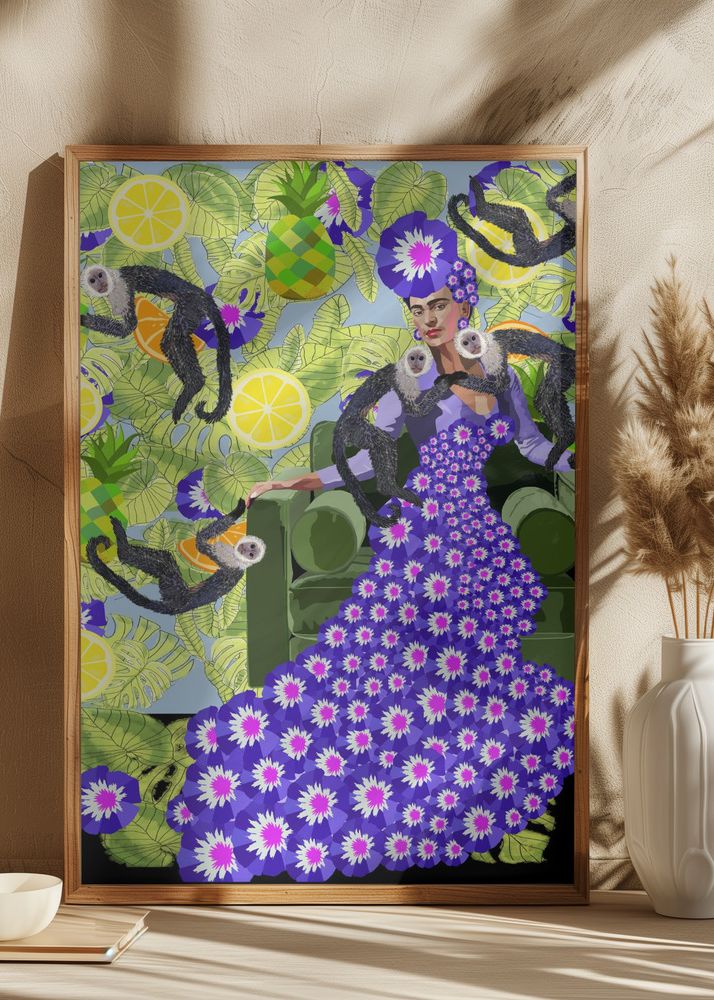 Denna livfulla poster fångar uppmärksamheten med sina fantasifulla illustrationer och färgsprakande detaljer. Motivet visar en kvinna i en klänning prydd med lila blommor, omgiven av lekfulla sengångare. Bakgrunden livas upp av gröna blad och färgglada frukter som citroner och ananas, vilket skapar en exotisk atmosfär. Perfekt som affisch för att ge ett rum en djärv och kreativ touch.