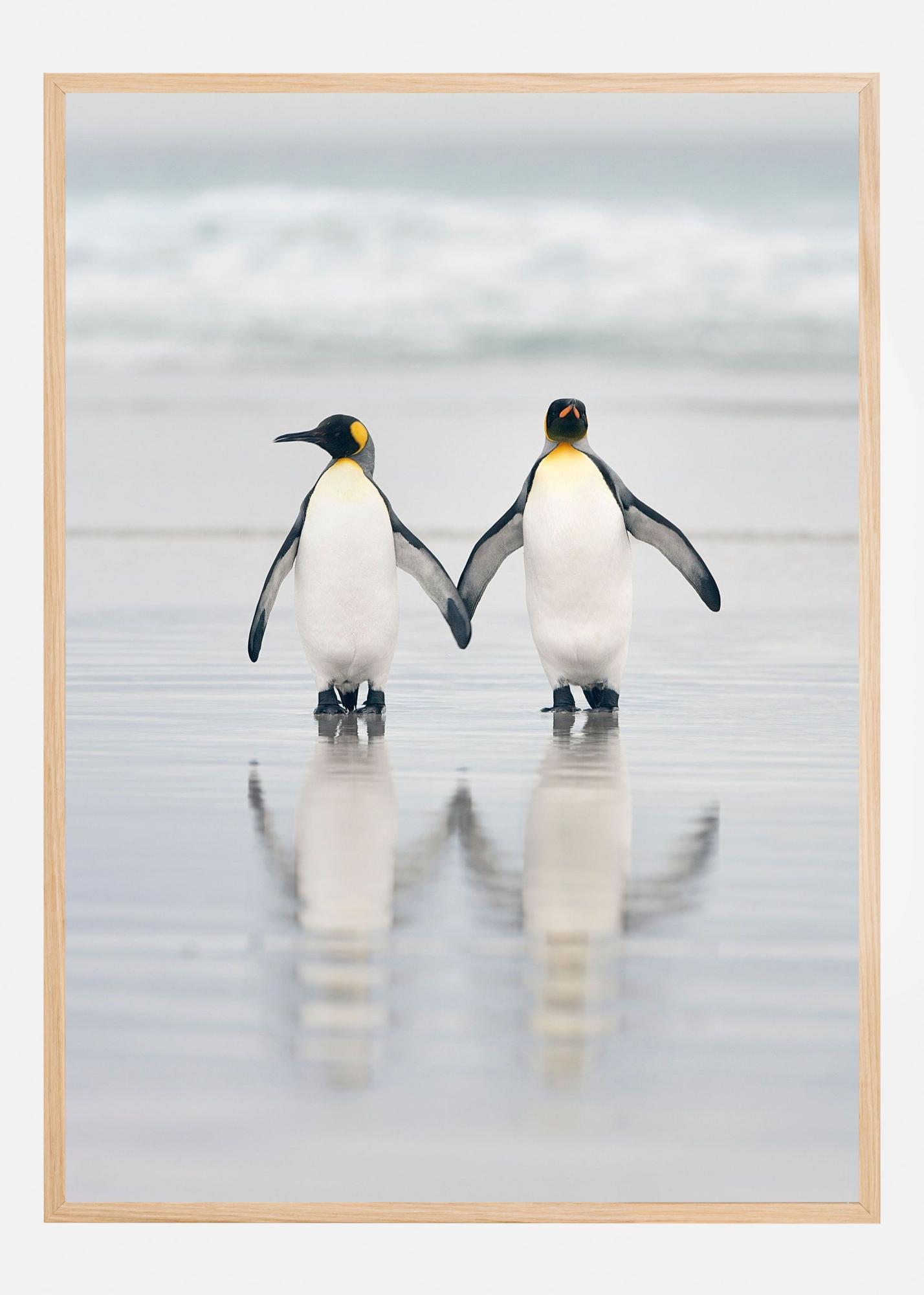 Denna stilrena poster fångar två majestätiska pingviner som promenerar sida vid sida på en spegelblank strand. Motivet utstrålar en känsla av gemenskap och harmoni, vilket gör det till en perfekt print för att skapa en lugn och fridfull atmosfär i ditt hem. Perfekt som en affisch för naturälskare eller den som söker en minimalistisk touch i inredningen.