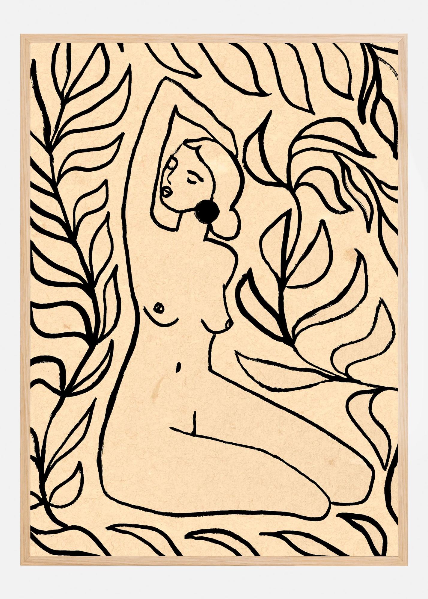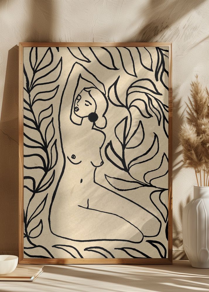 Denna eleganta poster presenterar en minimalistisk linjeteckning av en kvinnlig figur omgiven av organiska bladmotiv. Den simpla men uttrycksfulla designen förmedlar en känsla av tidlös skönhet och konstnärlig elegans, vilket gör den till ett perfekt tillskott till alla moderna interiörer. Affischen går i en stil som lätt smälter in i olika typer av heminredningar, samtidigt som den erbjuder en unik och sofistikerad touch.