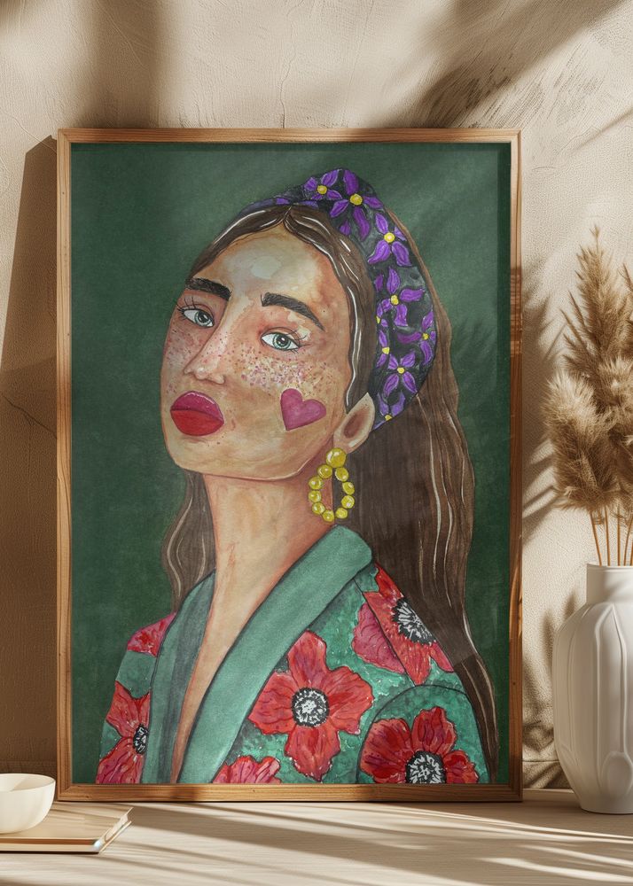 Färgpaletten i denna affisch består av djupa gröna nyanser i bakgrunden, som kontrasterar vackert med de livfulla röda och lila tonerna i kvinnans klädsel och accessoarer. Hennes kläder pryds av röda blommor, vilket ger en känsla av modern elegans. Detaljer som de gula örhängena och lila hårbandet tillför en lekfull touch, medan den dämpade rosa hjärtformen på hennes kind ger en subtil charm. Denna print utstrålar kreativitet och är ett utmärkt val för den som söker något annorlunda att dekorera väggarna med.