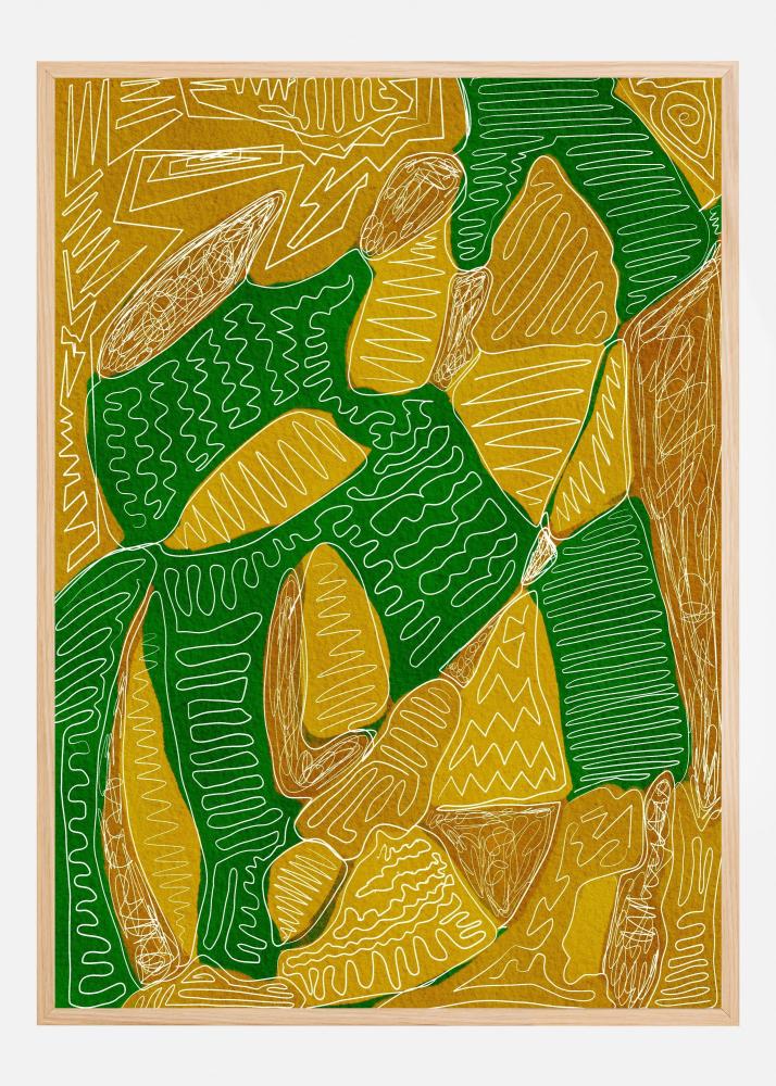 Denna print är ett utmärkt val för att lysa upp ett rum och skapa visuell intresse. De vita detaljerna ger djup och kontrast till de varma gula och gröna tonerna, vilket ger affischen ett unikt uttryck. Perfekt för ett modernt eller eklektiskt hem, denna poster blir snabbt en konversationsstartare med sin levande och energiska design.