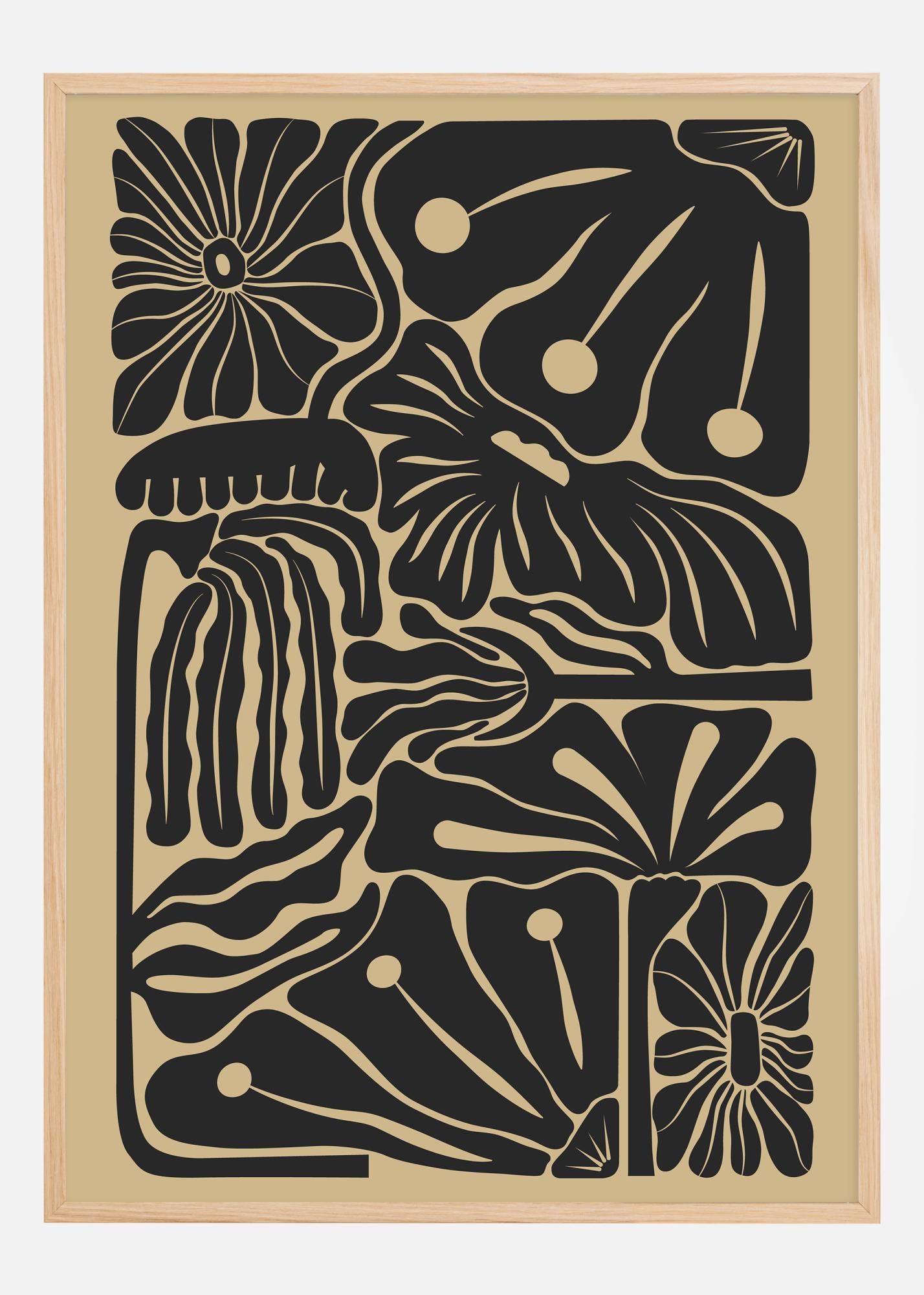 Denna stilrena poster ger ett modernt och avskalat intryck, perfekt för den trendmedvetna inredaren. Motivet visar en serie abstrakta former och linjer som påminner om blommor och blad i ett organiskt mönster. Det monokroma utförandet i djärva svarta detaljer på en beige bakgrund skapar en stark visuell kontrast som fångar ögat. Ett verk som passar utmärkt i en minimalistisk eller skandinavisk inredningsstil och adderar en känsla av natur utan att ta för stor plats visuellt.