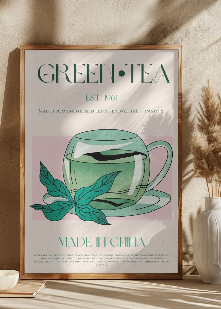 Affischen har en retroinspirerad design och inkluderar detaljer som kopparens reflektion och de noga tecknade tebladen. Kombinationen av de dämpade färgerna skapar en avkopplande atmosfär, perfekt för att komplettera ditt kök eller din matsal. Oavsett om du söker en modern touch eller en nostalgisk känsla, fångar denna affisch essensen av grönt te på ett tidlöst sätt.