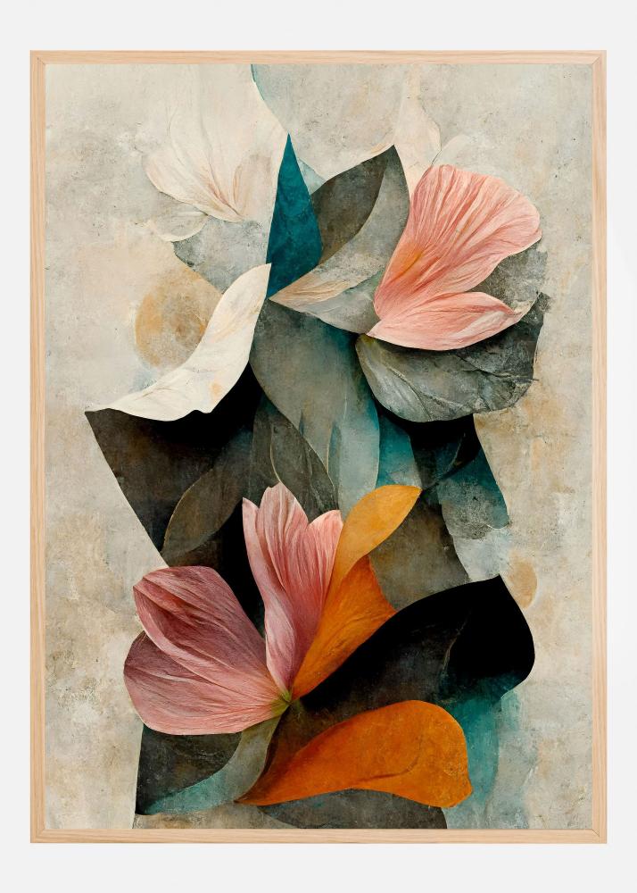 Den här postern visar ett elegant och konstnärligt motiv av blommor och blad i olika lager och dimensioner. Med en harmonisk blandning av mjuka och djupa färger skapar denna print en känsla av lugn och skönhet, perfekt för att ge liv åt vilket rum som helst. Mönstret är både modernt och tidlöst, vilket gör affischen till ett mångsidigt inredningsval.